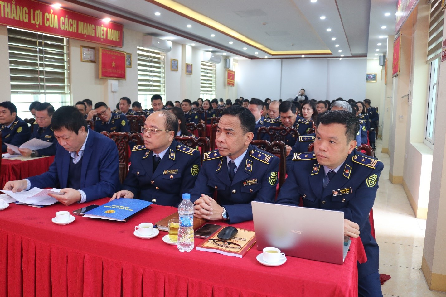 Lãnh đạo tham dự Hội nghị, theo dõi báo cáo kết quả thực hiện nhiệm vụ năm 2025 của lực lượng QLTT