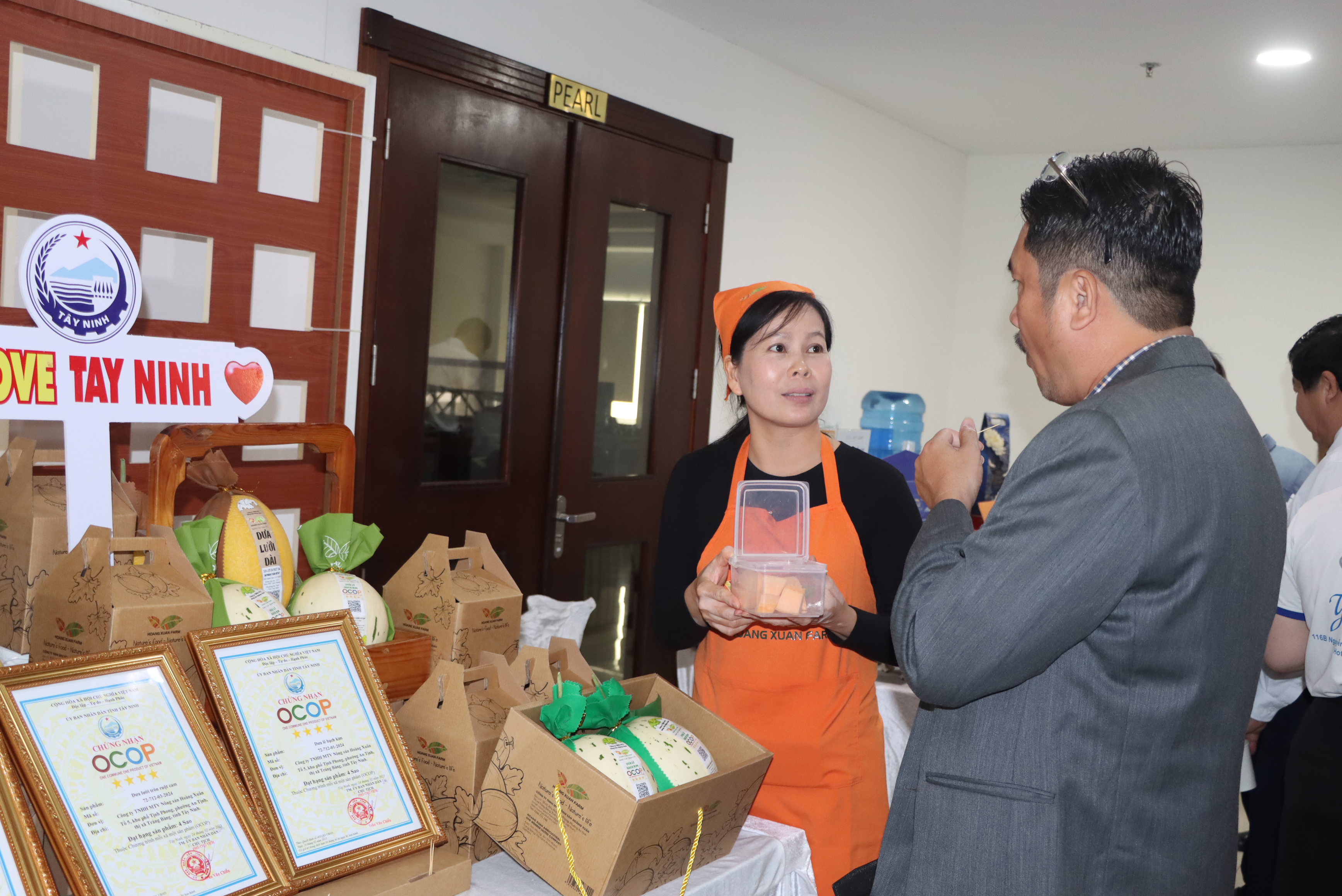 Phó Chủ tịch UBND tỉnh Tây Ninh Nguyễn Hồng Thanh mời Ngài Tith Rithipol thưởng thức đặc sản dưa lưới của Tây Ninh
