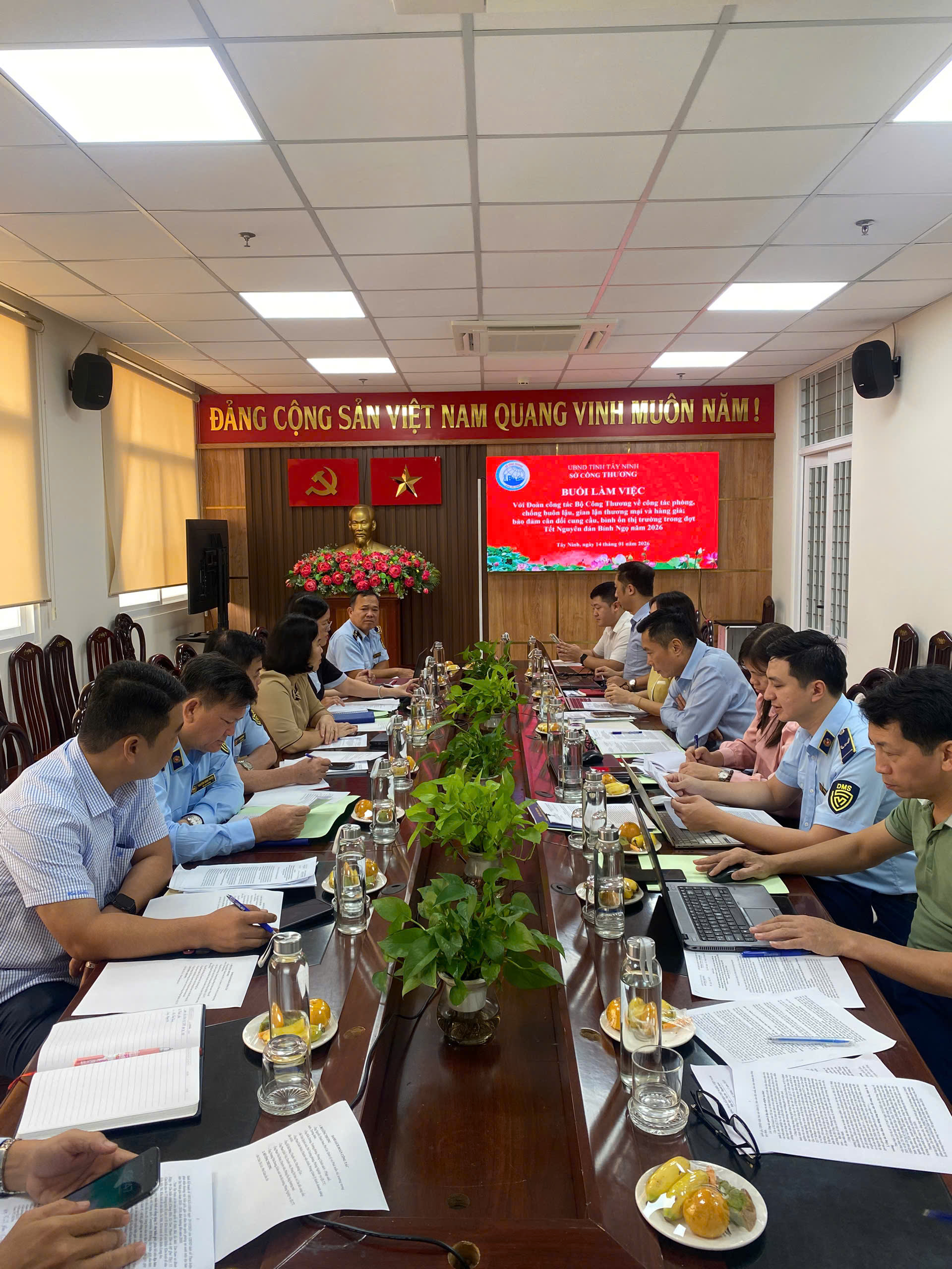 Thực hiện Quyết định số 07/QĐ-TTTN ngày 08/01/2026 của Cục trưởng Cục Quản lý và Phát triển thị trường trong nước, ngày 14/01/2026, Đoàn công tác của Cục Quản lý và Phát triển thị trường trong nước (Bộ Công Thương) do ông Nguyễn Thành Nam – Phó Cục trưởng làm Trưởng đoàn đã có buổi làm việc với Sở Công Thương tỉnh Tây Ninh nhằm kiểm tra, đôn đốc, hướng dẫn công tác phòng, chống buôn lậu, gian lận thương mại, hàng giả, đồng thời bảo đảm cân đối cung – cầu, bình ổn thị trường dịp Tết.