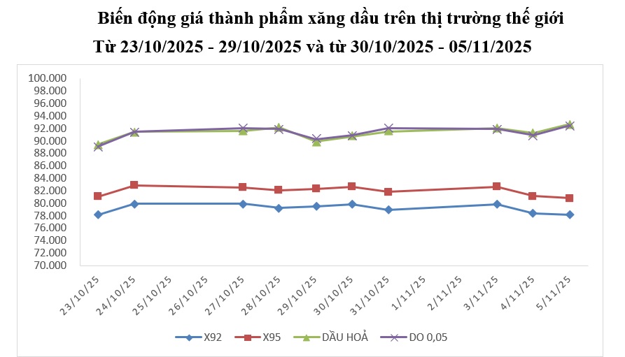 Bình quân giá thành phẩm xăng dầu thế giới giữa kỳ điều hành giá ngày 30/10/2025 và kỳ điều hành ngày 06/11/2025 là: 79,012 USD/thùng xăng RON92 dùng để pha chế xăng E5RON92 (giảm 0,40%); 81,792 USD/thùng xăng RON95 (giảm 0,45%); 91,634 USD/thùng dầu hỏa (tăng 0,78%); 91,626 USD/thùng dầu điêzen 0,05S (tăng 0,75%); 376,482 USD/tấn dầu mazut 180CST 3,5S (giảm 2,88%).