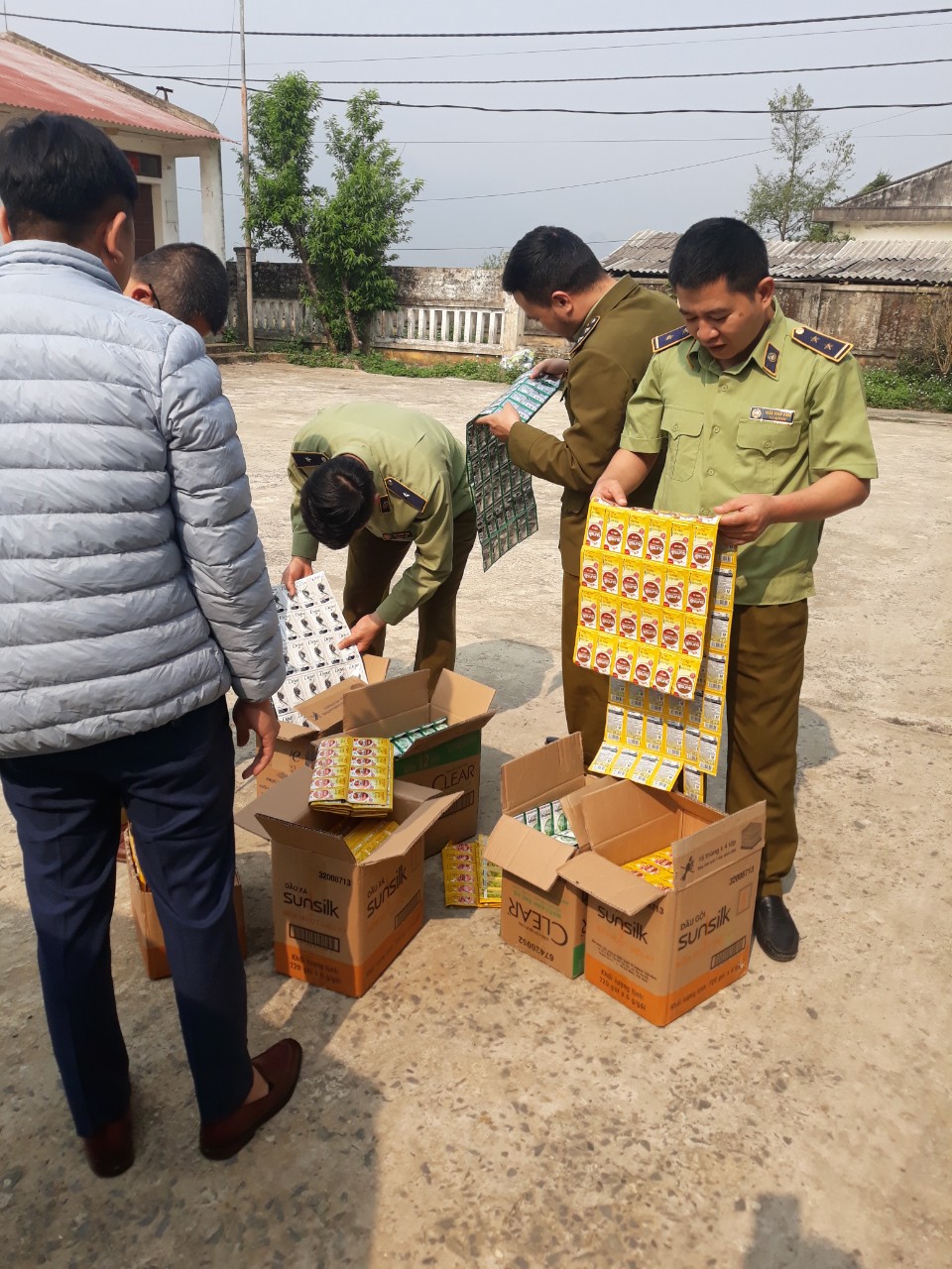 Đội QLTT số 1 phối hợp với Phòng PC 03 - Công an tỉnh Lai Châu kiểm tra, phát hiện xử lý và thu giữ 2.968 gói dầu gội đầu giả nhãn hiệu Clear, Sunsilk và Dove.